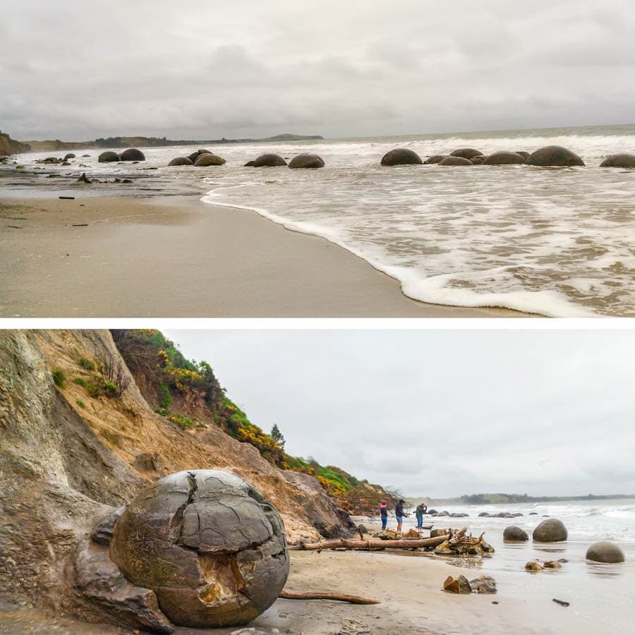 告別但尼丁,往北可抵達「摩拉基大圓石」的海邊,海灘上散落一顆顆的大圓石,有的碎裂如露出蛋黃般,有的表面密布裂紋如茶葉蛋,由於形體碩大,因此被稱為「巨型恐龍蛋」。